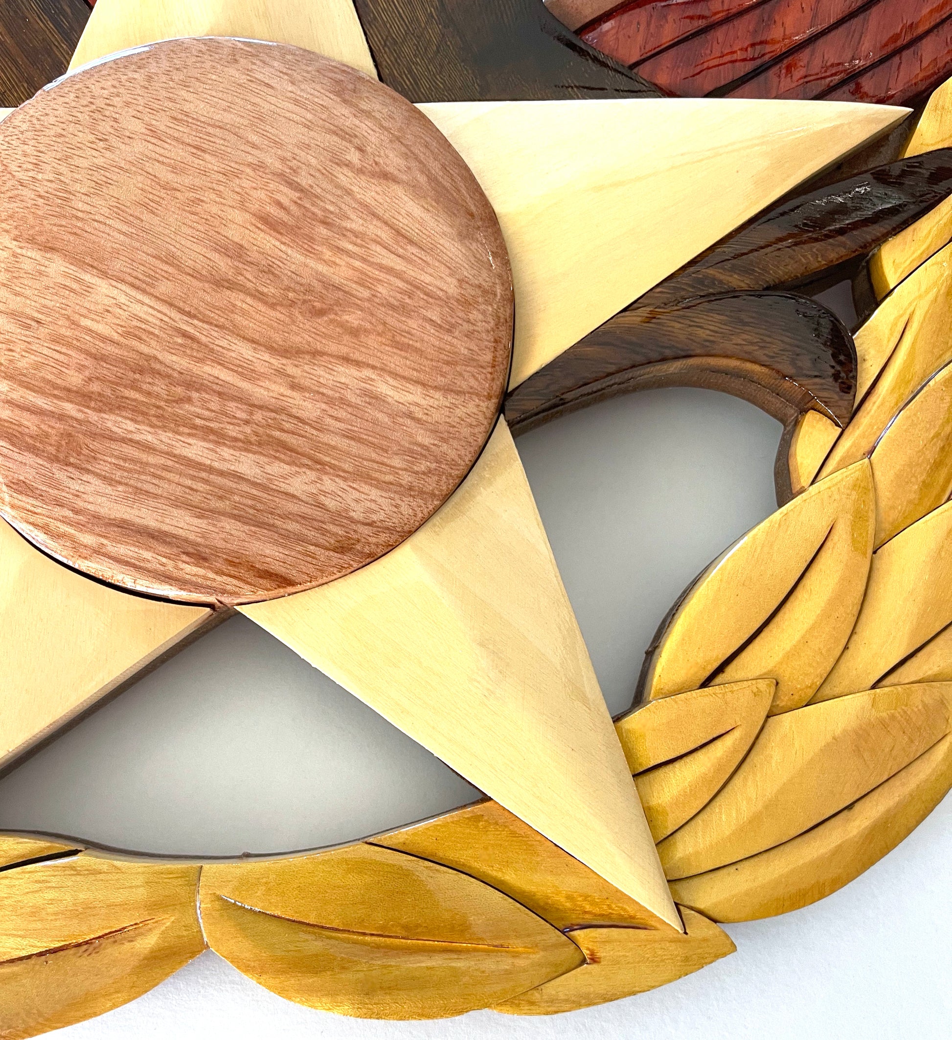 Our Wood Art USAF CC Badge is carefully crafted from six (6) different fine hardwoods. The Star has nice sharp points and the wreath is highly detailed.