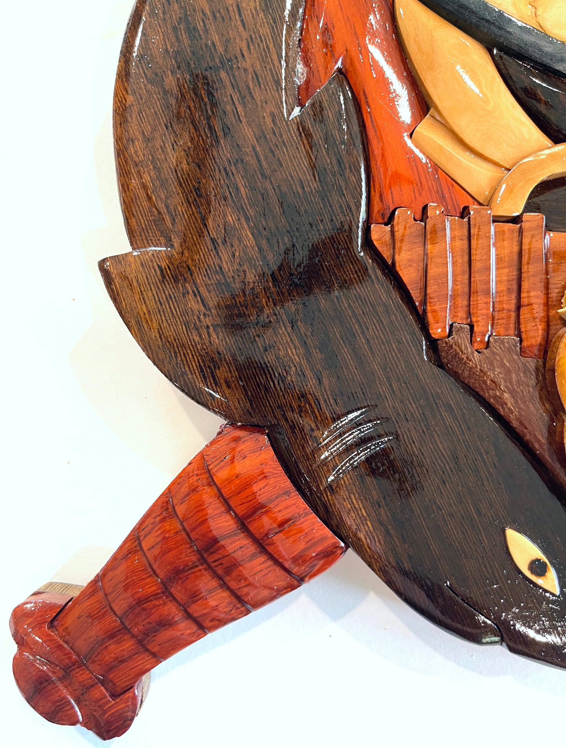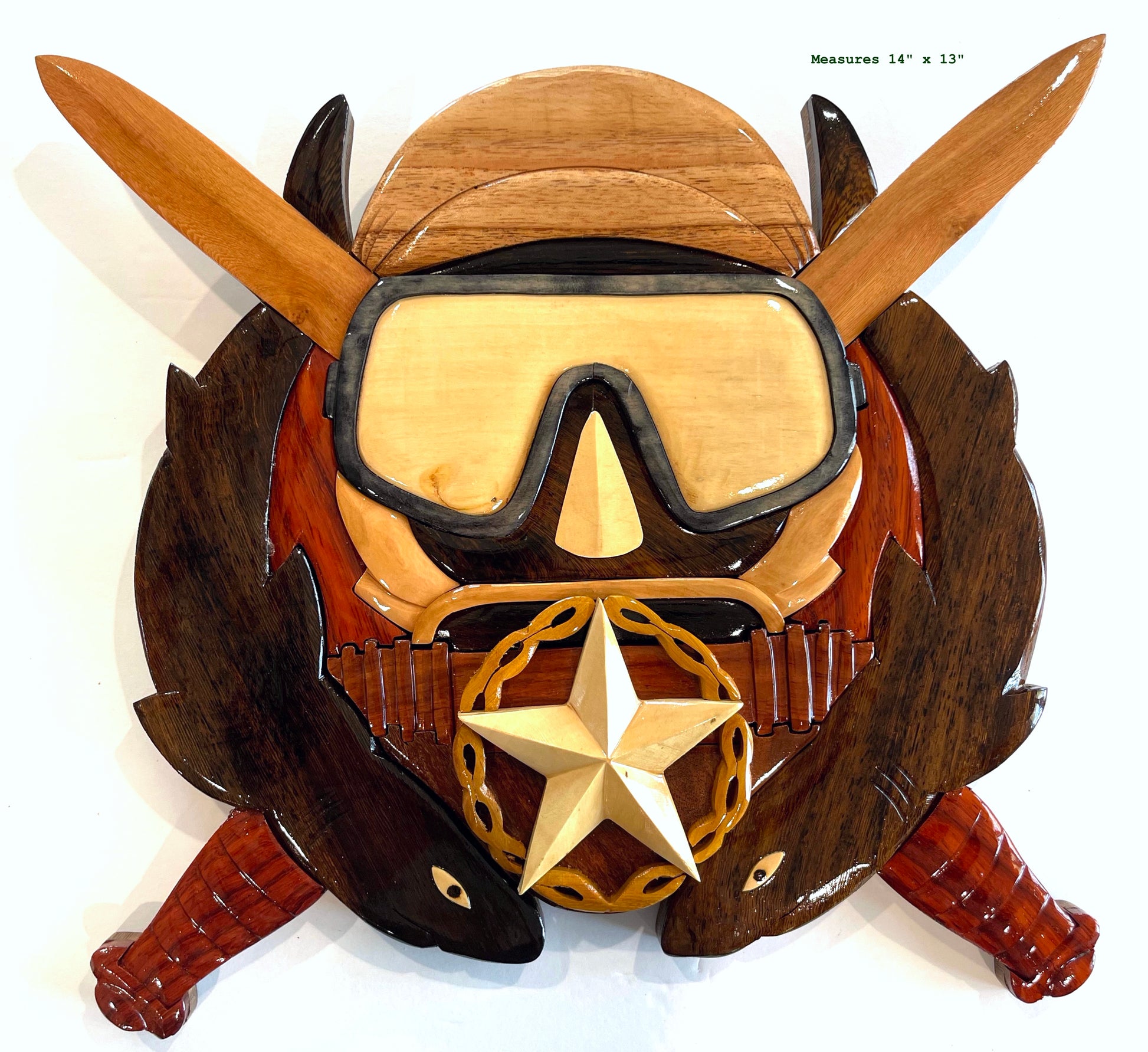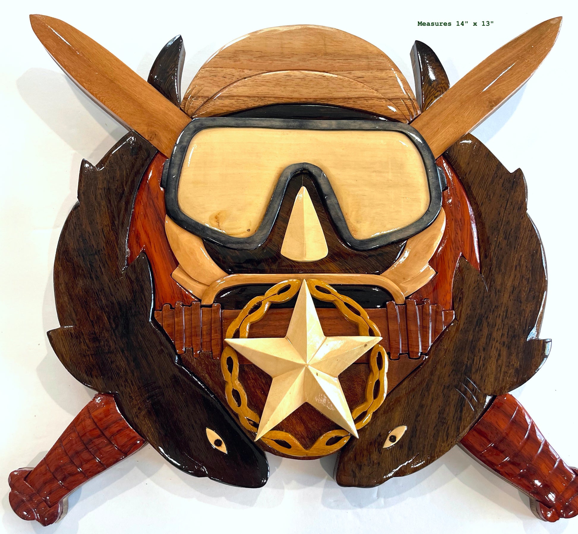 Handcrafted from 7 different All-Natural hardwoods, our Master Combat Diver Badge Wood Art Plaque measures approx 14" x 13". Our Artists Inlay the Shark Eyes, carefully Sculpt the Knife Handles, carefully create the Master-degree Wreath & Star, and create a true 3-D effect through Intarsia-style Wood Art.